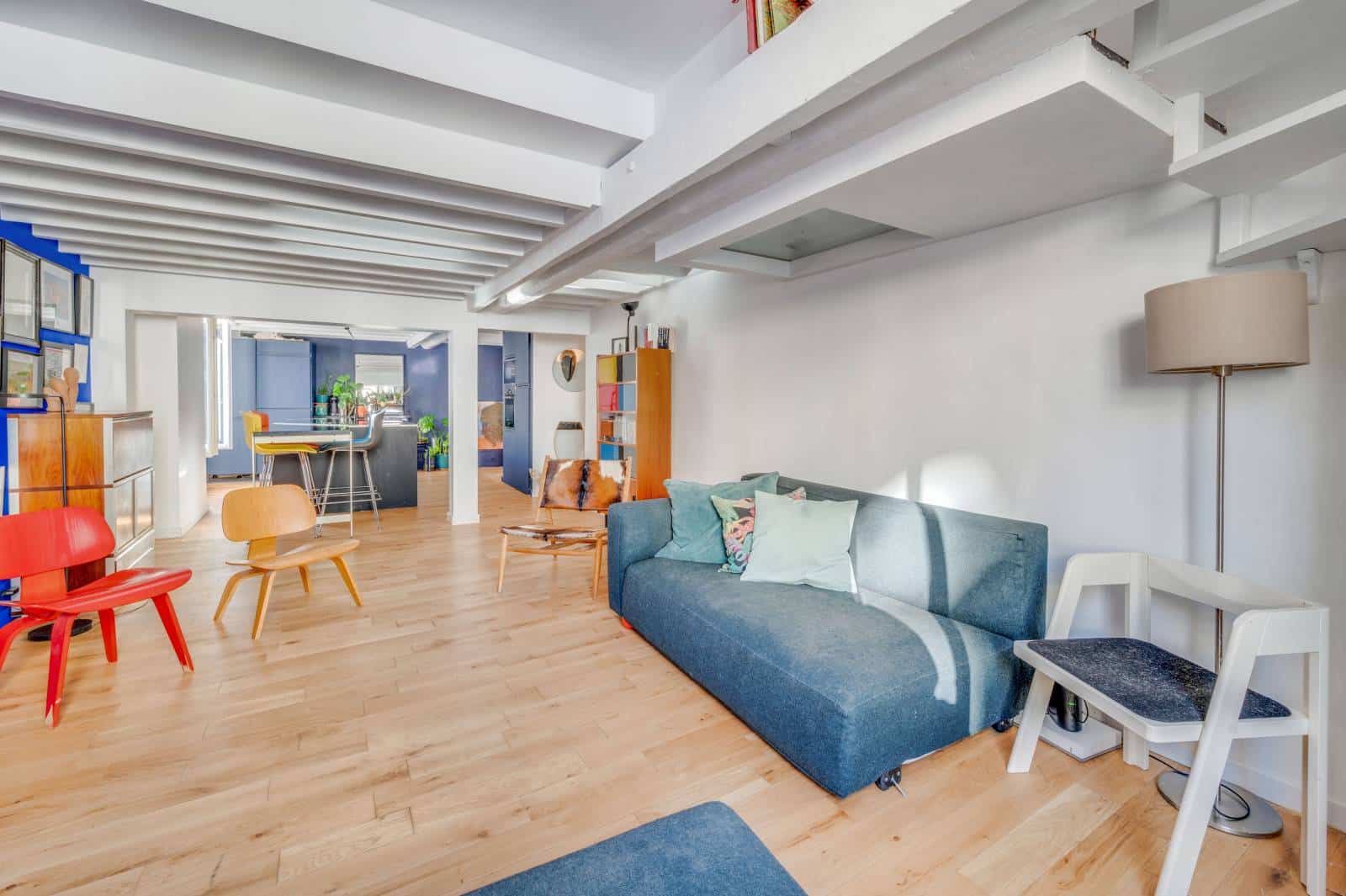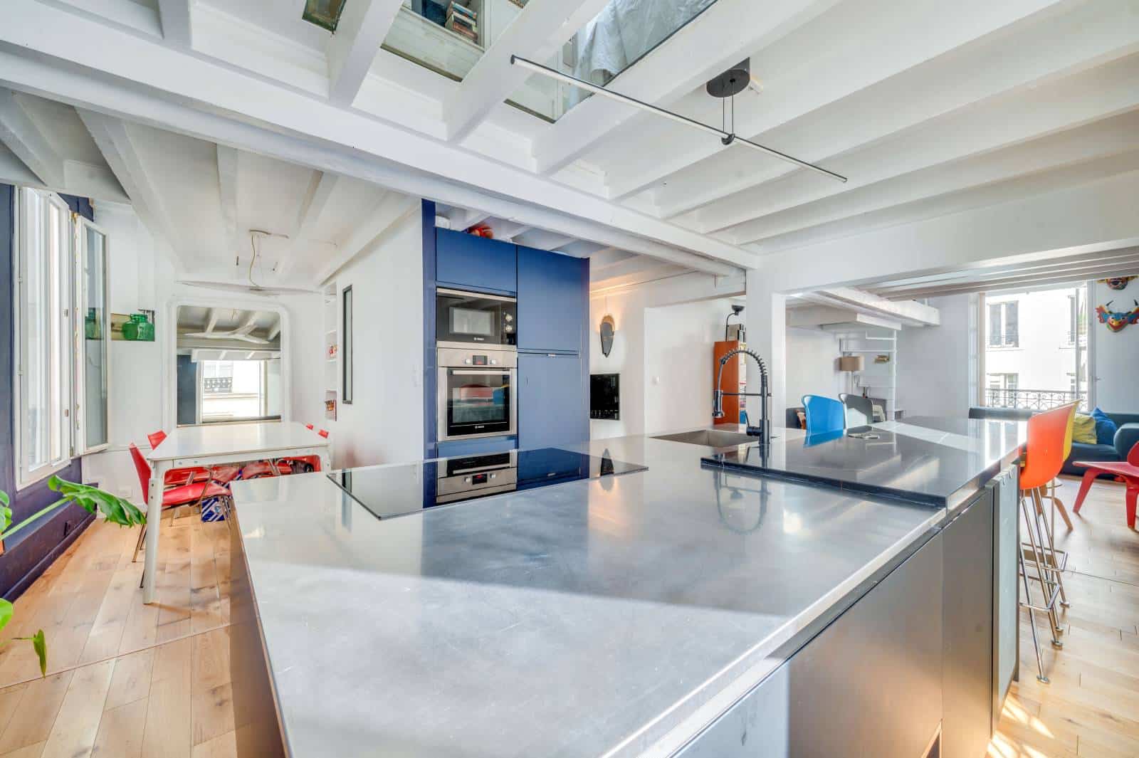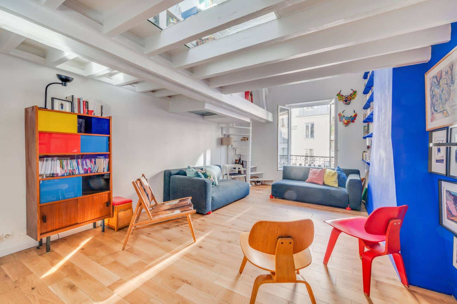 The home combines the authentic charm of historic Paris exposed beams, unique volumes with a sleek, contemporary renovation, creating a warm and distinctive ambiance.
