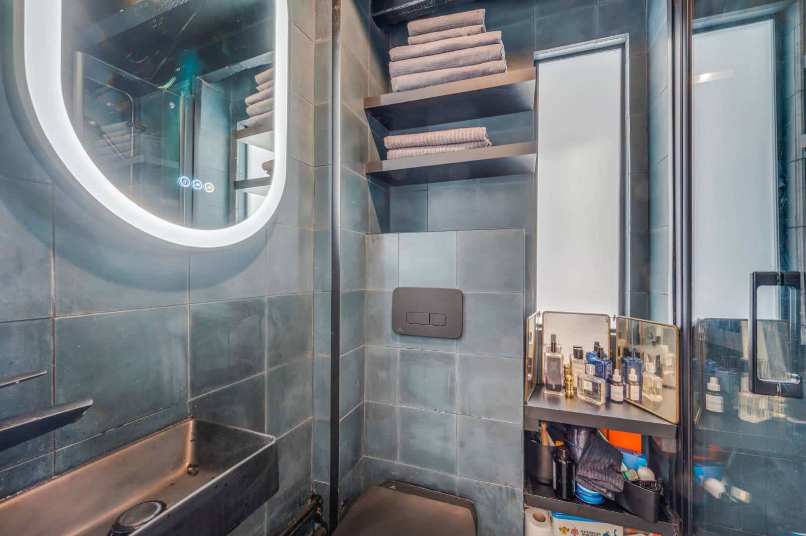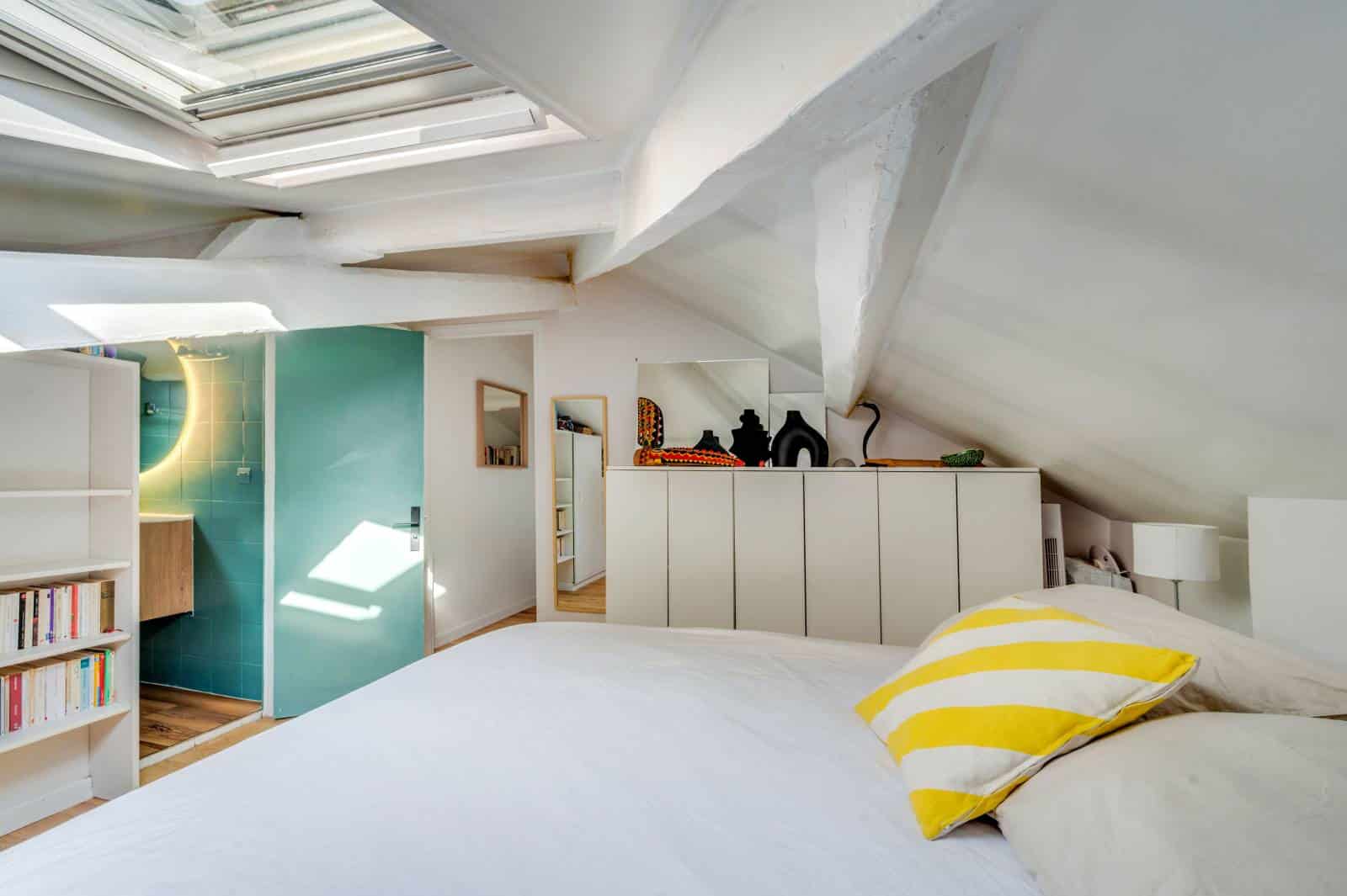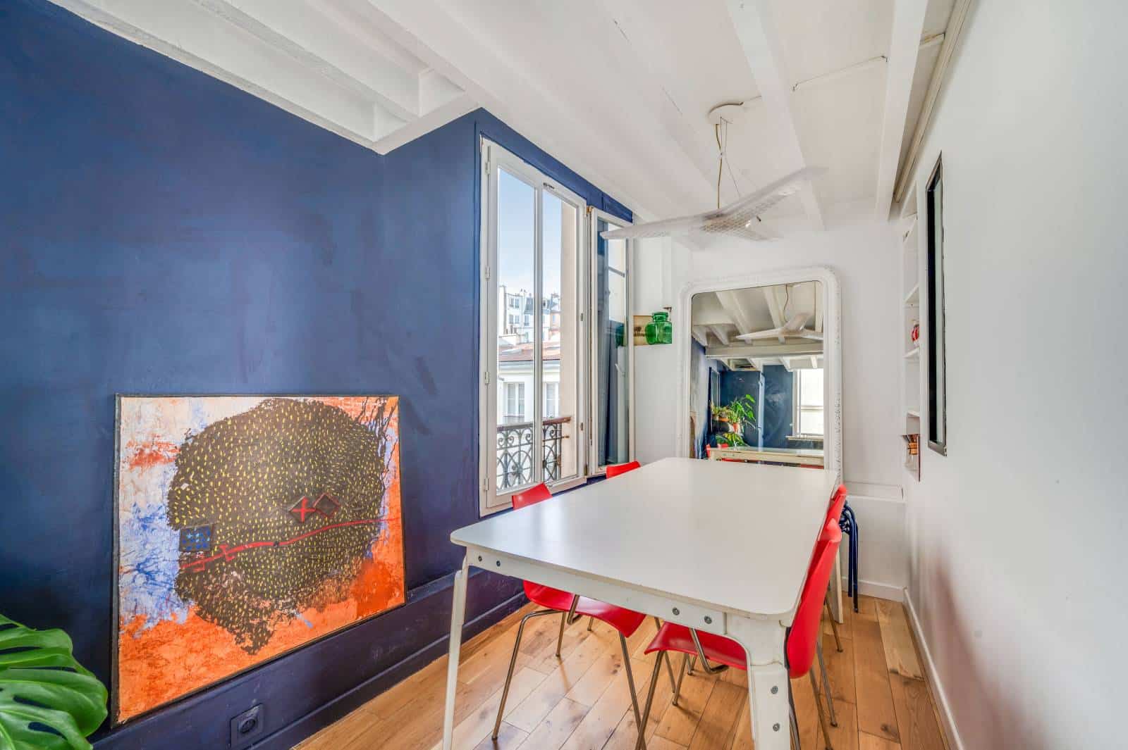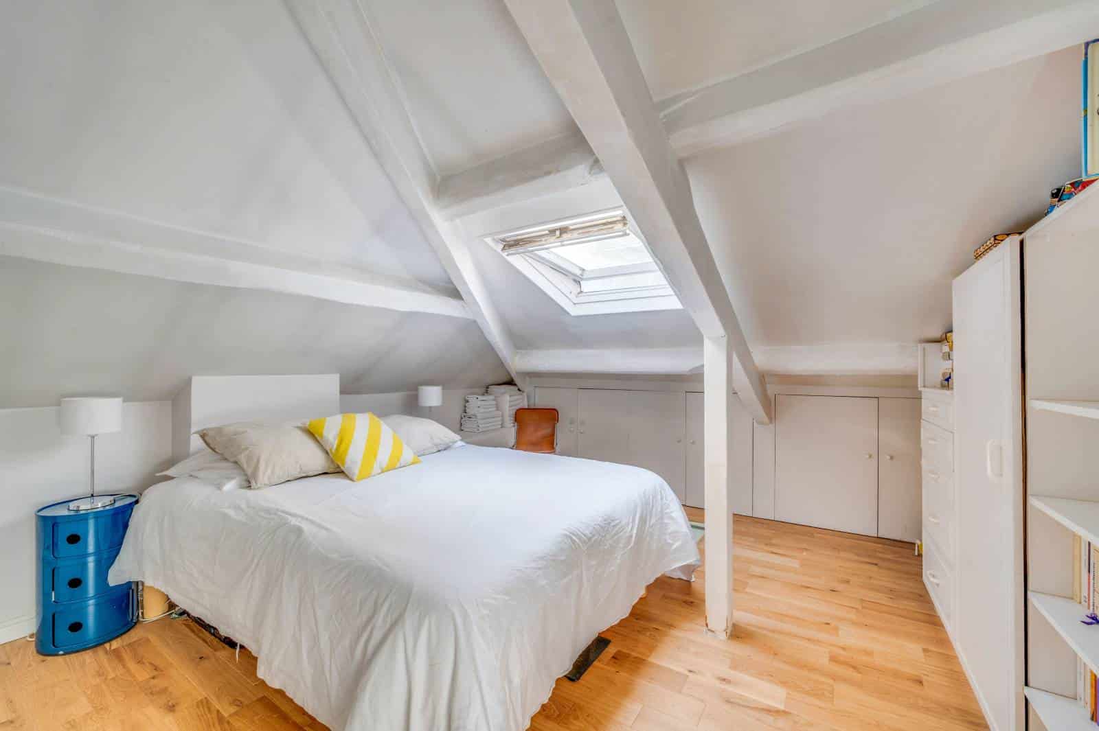 The home combines the authentic charm of historic Paris exposed beams, unique volumes with a sleek, contemporary renovation, creating a warm and distinctive ambiance.
