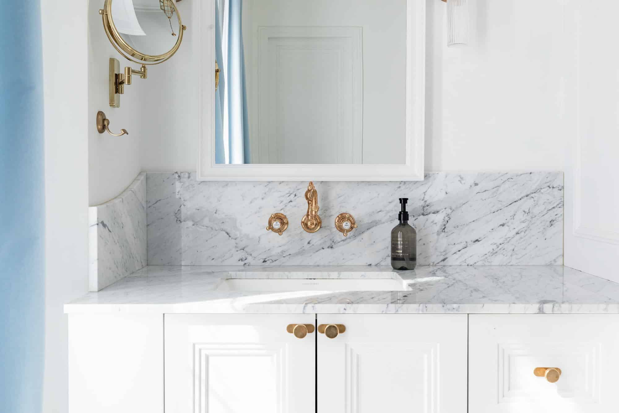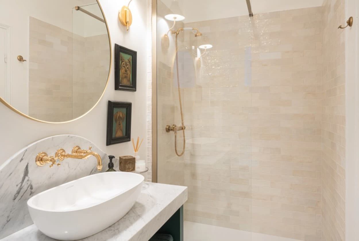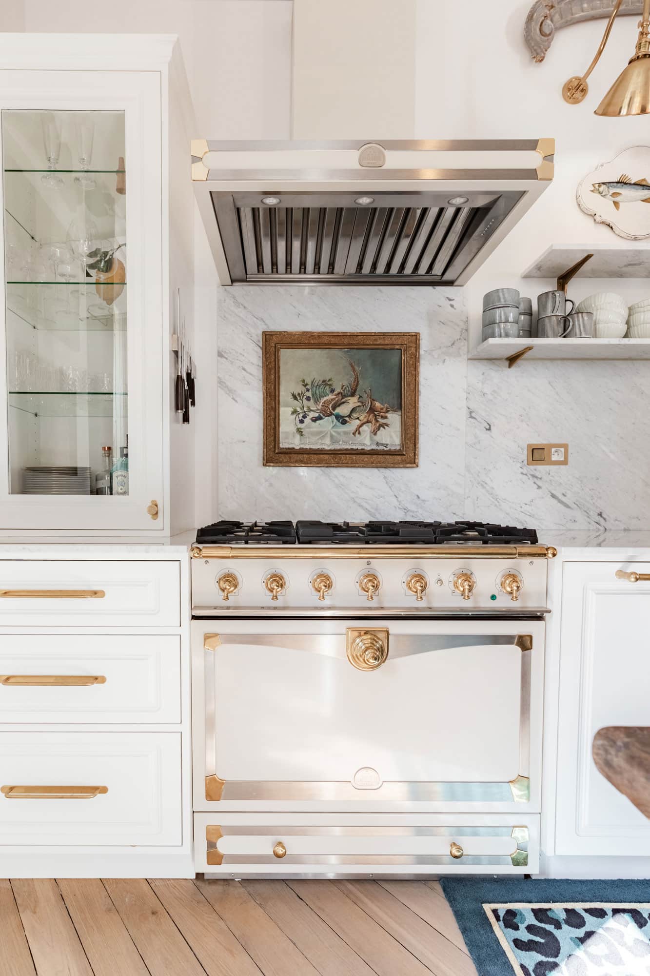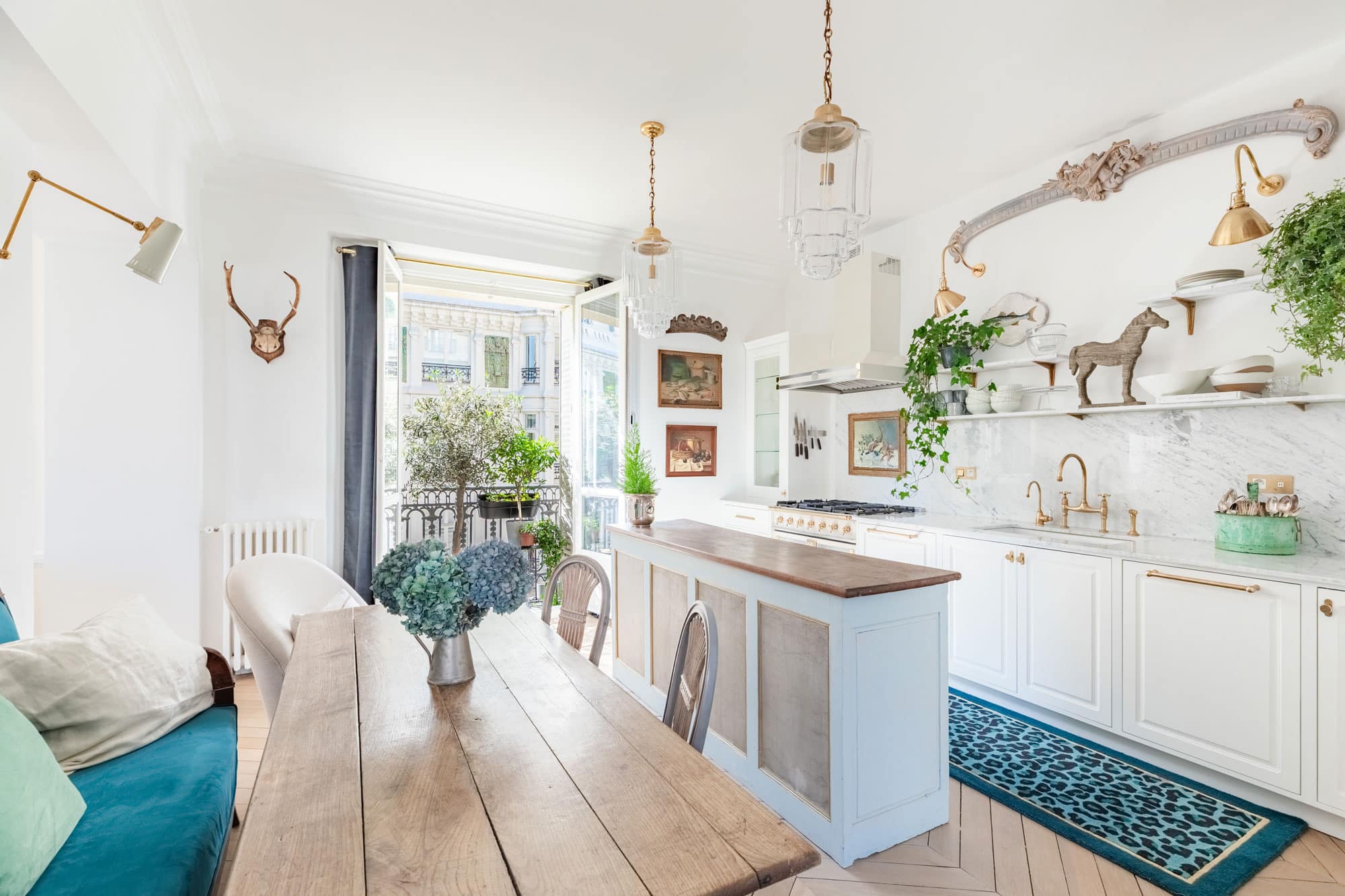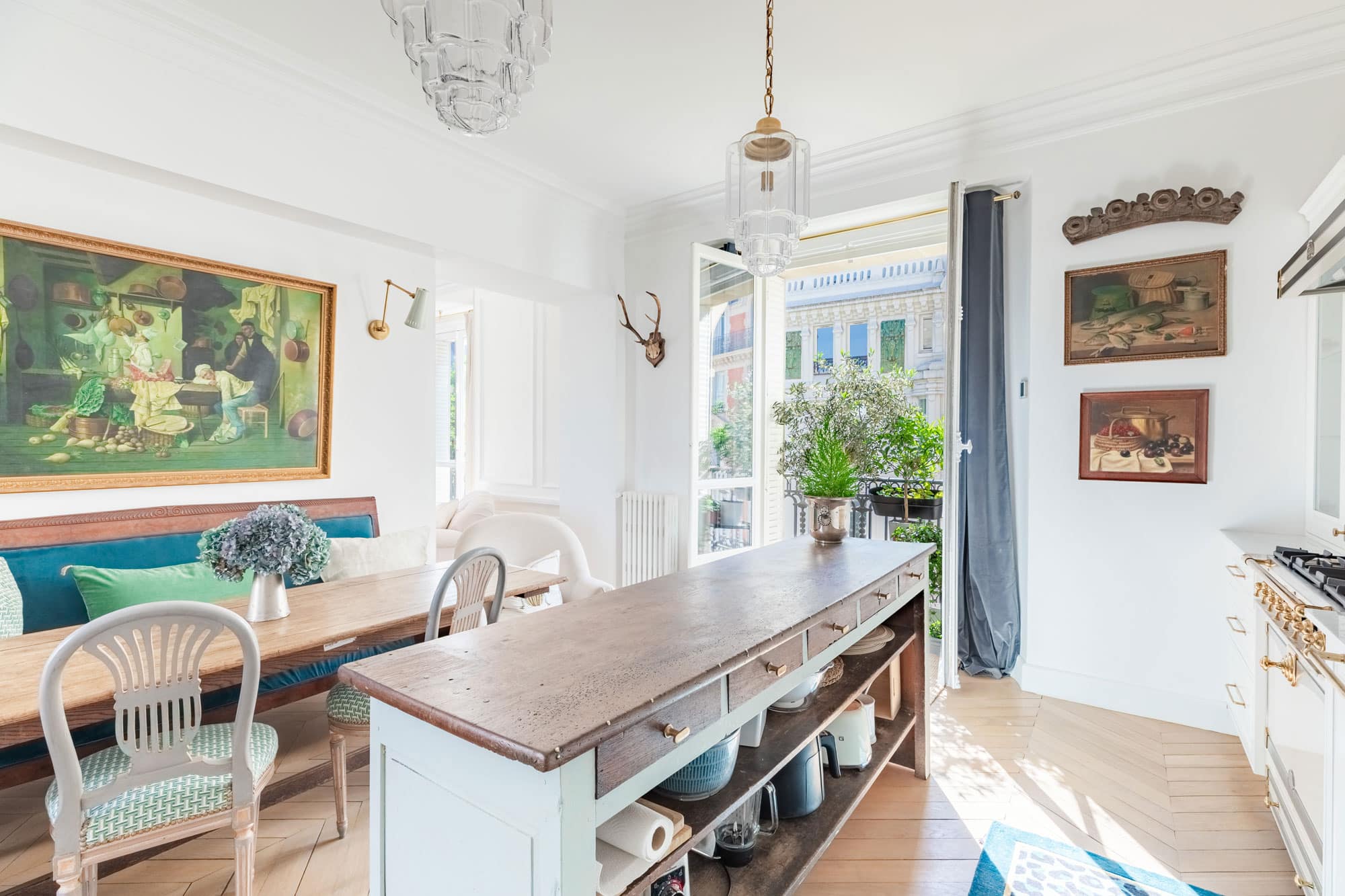 The appointed designer kitchen masterfully unites aesthetic appeal with practicality. Distinguished appointments include a La Cornue range, veined marble surfaces, and burnished brass fittings. A weathered dining table establishes an inviting tableau for convivial Parisian gatherings.