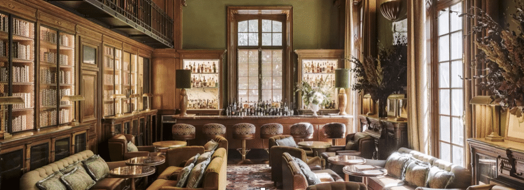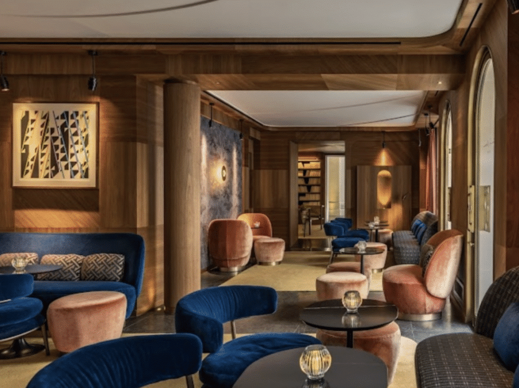 Golden light, velvet alcoves, and polished brass—a cocktail here feels like a scene from a Paris novel. The bar sits within the Pavillon Faubourg Saint-Germain, just a short walk from the Seine and Café de Flore.
